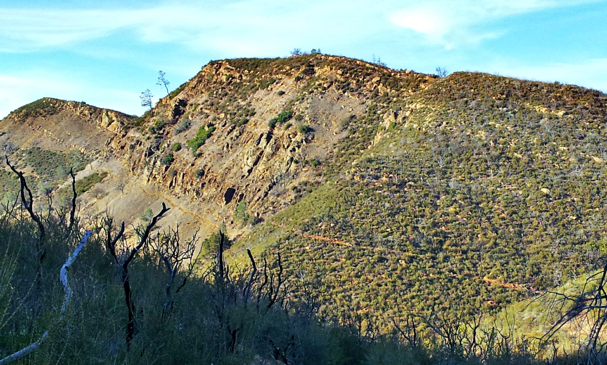 Continue on the trail as it begins to drop, slowly, into Green Canyon. Along the way you will see some gorgeous palisades. These are on the private Ahmann parcel so stay on the trail. Once you are at the bottom of Green Canyon you will have passed onto BLM public lands and will remain on BLM for the rest of the hike. The trail climbs out of Green Canyon, crosses another small drainage, then begins to again climb to the ridge. After 1.5 miles you will find the end of the hiking portion of the route at an intersection with a gravel service road. Continue south on the service road for another 1.2 miles to the summit of Berryessa Peak and the transmitter towers..