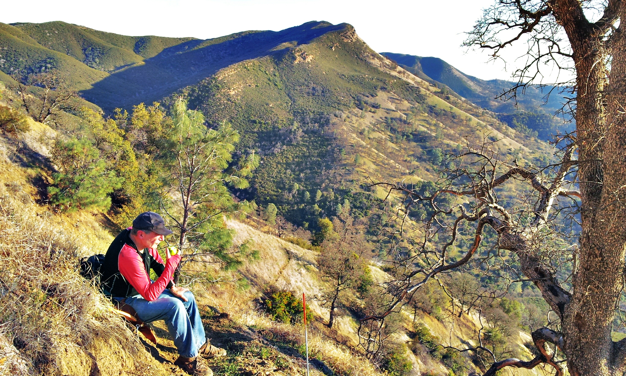 If you opt to only go halfway, there is a nice picnic spot on the ridge slightly less than one mile from the easement fence crossing. You can get to the ridge by climbing up a small draw. Look for a grove of oaks and pines to mark the site. This is as high as this section of trail will get to the ridge proper.