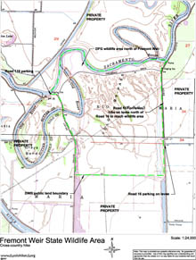 The Department of Water Resources (DWR) owns about 1000 acres in the Yolo Basin. The Department of Fish and Game (DFG) manages a portion of the property as the Fremont Weir State Wildlife Area. This area is open to the public for hiking, hunting, horseback riding, and mountain biking. Link to DFG's map of the area.